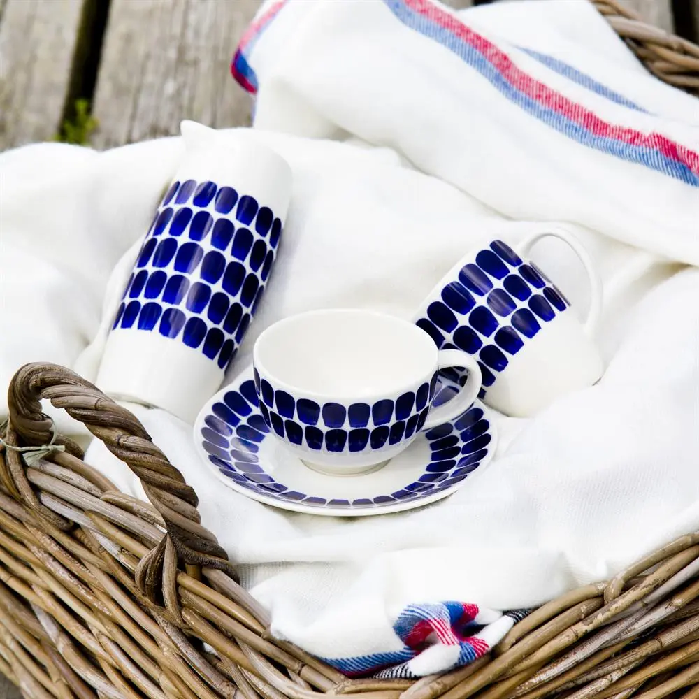 La taza 24h Tuokio es una de las piezas que forman la preciosa vajilla de porcelana 24h, creada por Heikki Orvola para Arabia en 1996. En el otoño del 2011, la serie 24h se actualizó con bonitas decoraciones azules y pasó a llamarse 24h Tuokio. En la serie puedes encontrar plato, cuenco, taza de café, platillo (se vende por separado), taza y jarra.
